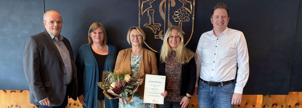 Bürgermeister Steffen Weiß würdigte Frau Heid mit einer Urkunde, einem Blumenstrauß und einem kleinen Präsent. Gemeinsam mit dem geschäftsführenden Beamten Tobias Simon, Kathrin Daum, stellvertretende Abteilungsleiterin der Ordnungs- und Sozialverwaltung, und der stellvertretenden Vorsitzenden des Personalrats, Susanne Buchfink, sprach Herr Weiß Frau Heid seinen herzlichen Dank für ihren langjährigen und engagierten Einsatz im öffentlichen Dienst aus.