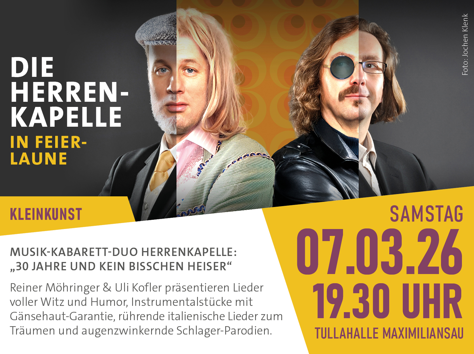 Das Karlsruher Musik-Kabarett-Duo „Die Herrenkapelle“ hat besten Grund zu Feiern, denn seit 30 Jahren stehen die beiden Virtuosen sehr erfolgreich gemeinsam auf den Bühnen Süddeutschlands.